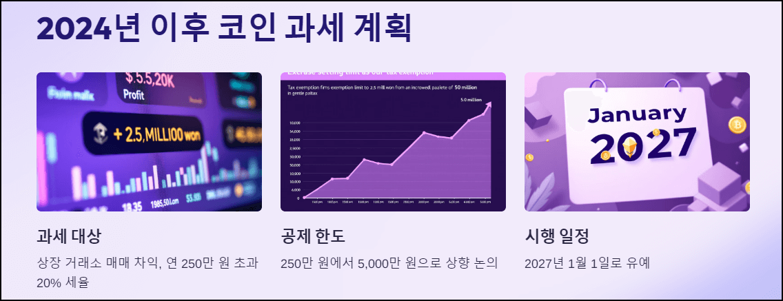 현재 가상자산 과세는 2027년 1월 1일로 유예된 상태입니다. 주요 과세 방안은 다음과 같습니다.