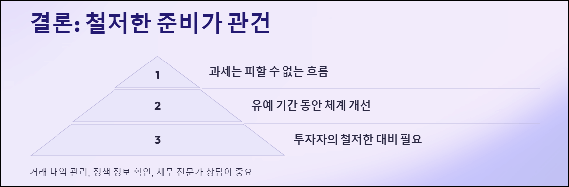 투자자들은 거래 내역 관리를 철저히 하고, 최신 정책 정보를 지속적으로 확인하며, 세무 전문가의 도움을 받는 것이 중요합니다. 철저한 준비만이 과세 시행 후의 혼란을 최소화할 수 있을 것입니다.