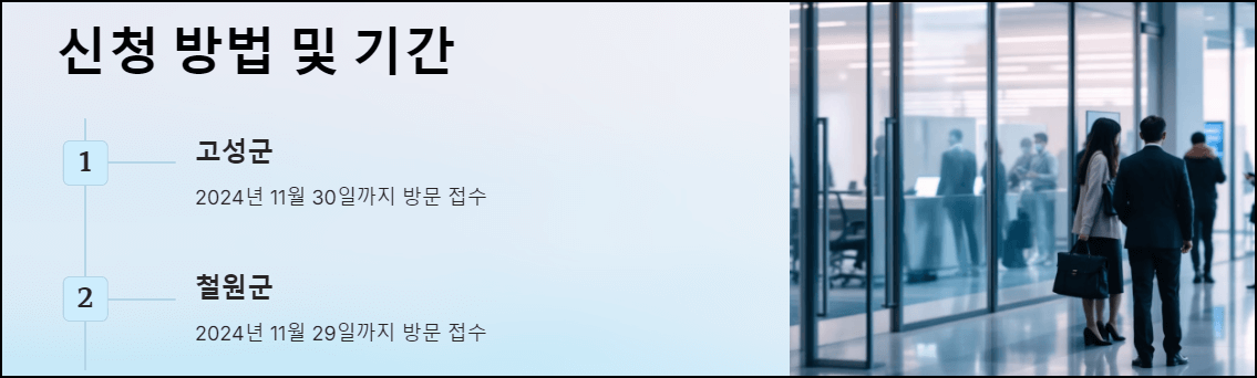 - 고성군과 철원군 각각의 마감일(11월 29일~30일)을 확인 후 접수해야 합니다.