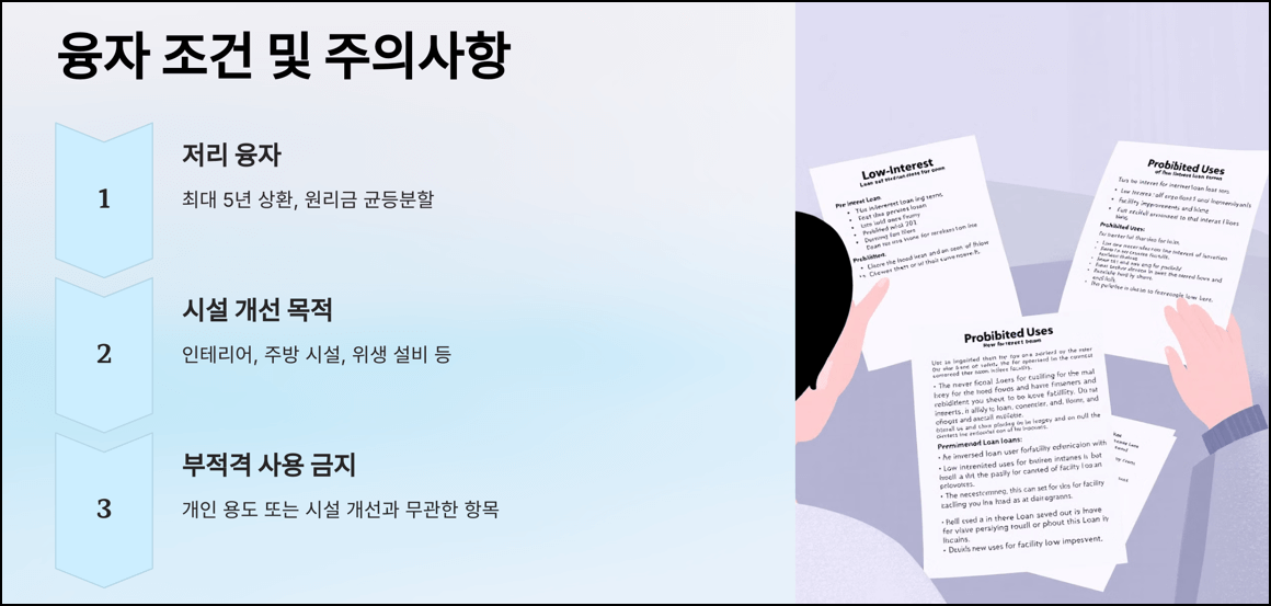 융자금은 단순 대출이 아닌 시설 개선을 목적으로 하므로, 지원받은 금액을 시설 개선 외의 용도로 사용할 수 없습니다.