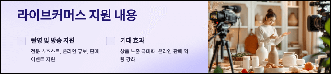 - 라이브커머스 촬영 및 방송 지원: 소상공인의 상품을 촬영하고 방송을 통해 홍보