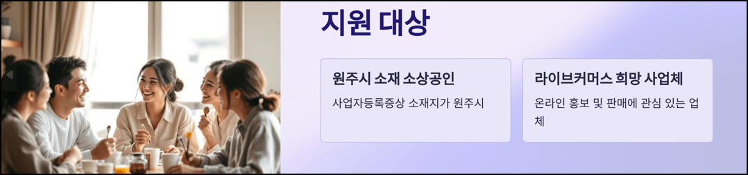 이번 라이브커머스 지원 프로그램의 대상은 원주시 소재 소상공인입니다. 단, 사업자등록증상 소재지가 원주시로 등록되어 있어야 하며, 아래의 조건을 충족해야 합니다.