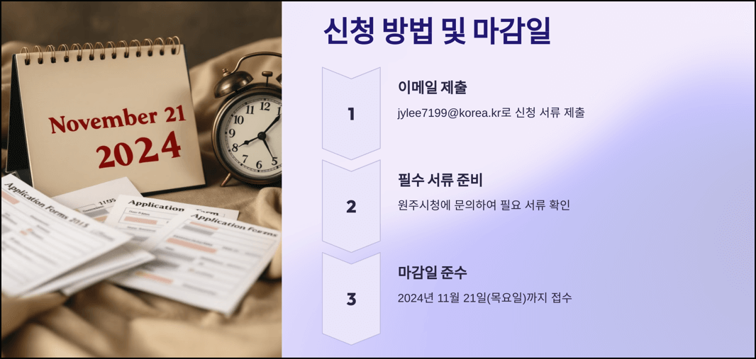 - 필수 서류: 제출 전 원주시청에 문의하여 준비할 서류를 확인할 것