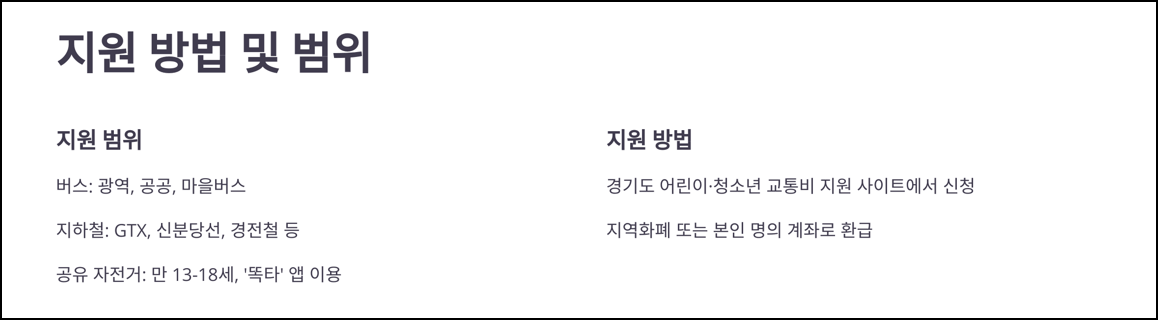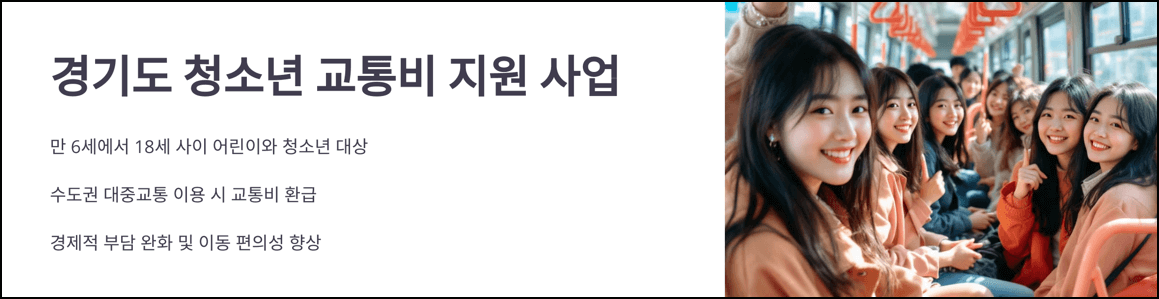 이 사업은 경기도가 주최하는 정책으로, 청소년들이 수도권 대중교통을 이용할 때 발생하는 실질적인 교통비를 지원하는 제도입니다.
