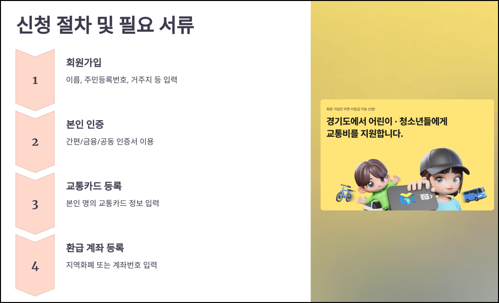 - 교통카드 등록: 어린이·청소년 본인 명의 교통카드 정보 입력