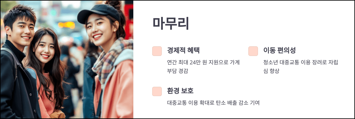 - 경제적 부담 완화: 연간 최대 24만 원까지 교통비 지원