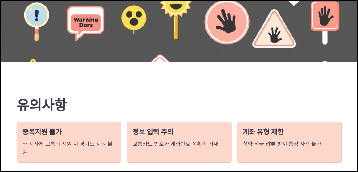 - 중앙부처 및 지자체에서 동일한 교통비를 지원받는 경우, 경기도 지원 불가(예: 화성시 무상교통 등).