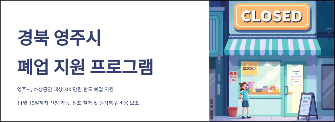 경북 영주시는 폐업 예정인 소상공인이 사업을 정리하는 데 필요한 비용을 보조하며, 지원 조건은 사업체 기준으로 적용됩니다.
