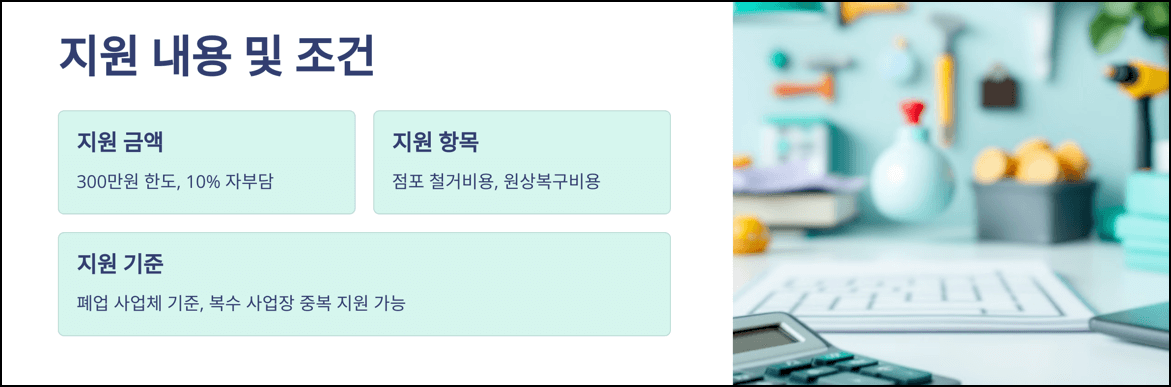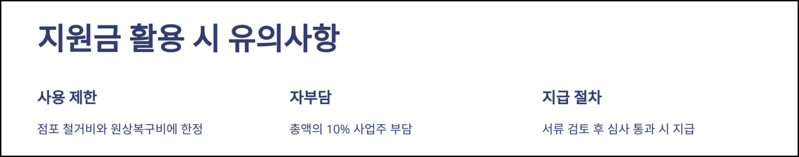 - 지원금 사용 범위: 점포 철거비와 원상복구비에 한정되어, 타 용도로는 사용할 수 없음.