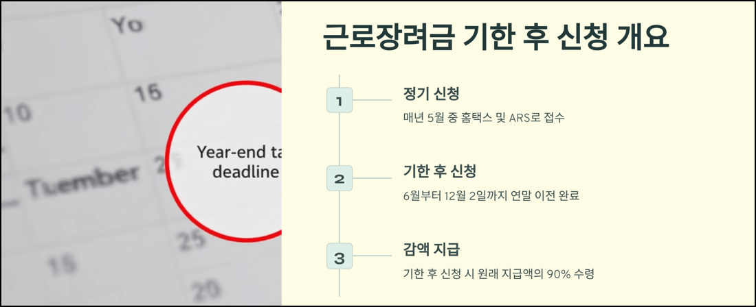 근로장려금 기한 후 신청은 정기 신청을 놓친 분들이 연말까지 추가로 신청할 수 있도록 제공되는 제도입니다. 다만, 기한 후 신청 시에는 지급액이 10% 감액되므로, 가급적 정기 신청을 완료하는 것이 바람직합니다.
