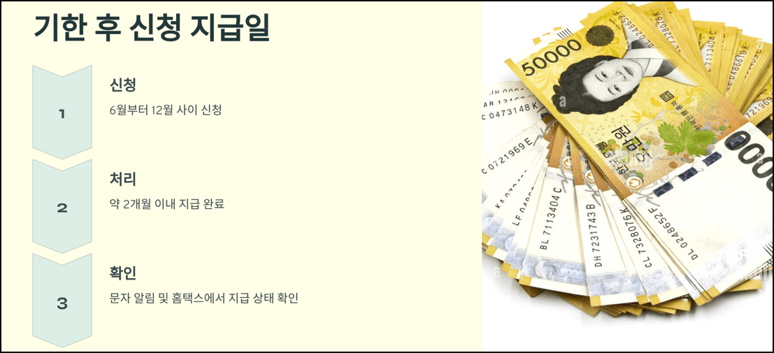 - 6월부터 12월 사이 신청: 신청 후 약 2개월 이내 지급 완료