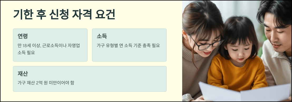 기한 후 신청 자격은 근로소득, 자영업 소득, 기타 소득을 포함해 연령, 소득, 재산 조건을 충족해야 합니다. 신청 전 본인이 자격 요건에 부합하는지 확인이 필요합니다.