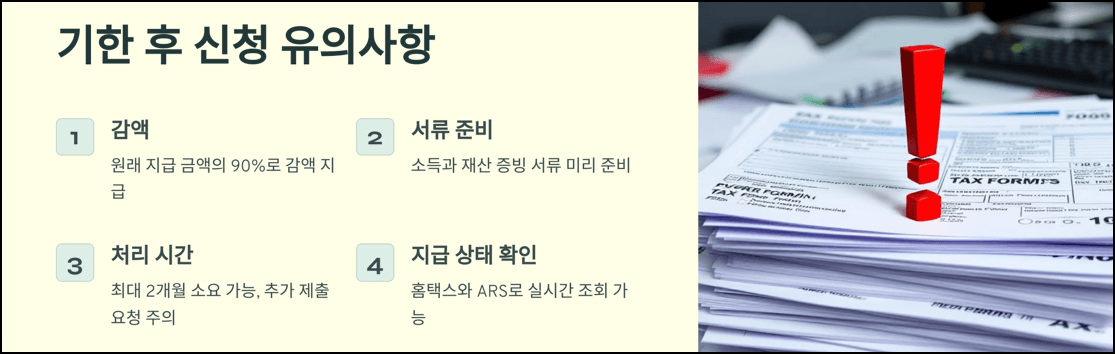기한 후 신청 시 유의해야 할 몇 가지 사항이 있습니다. 기한 후 신청은 일부 감액이 발생하며, 절차와 서류 준비에 소요 시간이 다소 걸릴 수 있으니 주의가 필요합니다.