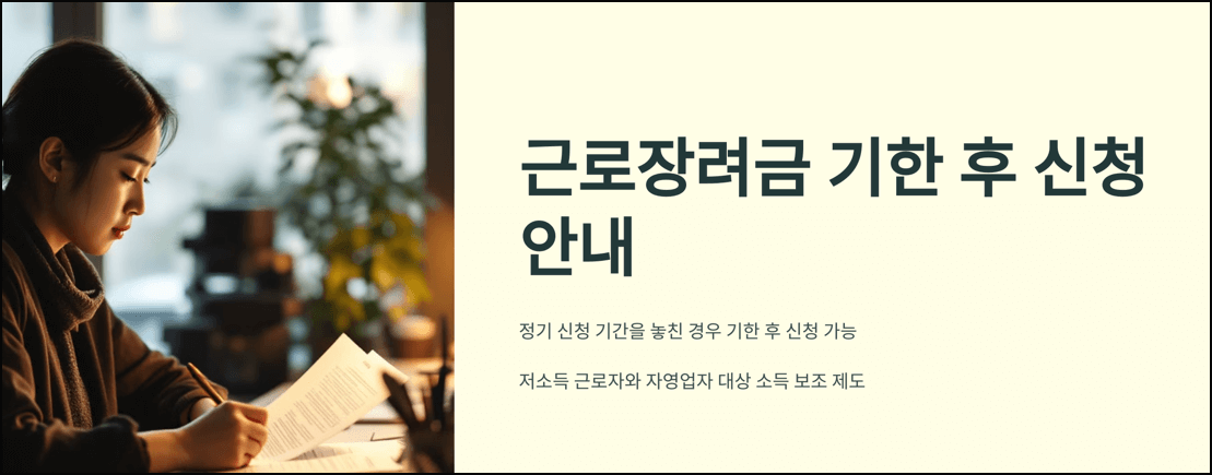 근로장려금을 신청할 수 있는 정기 신청 기간을 놓친 경우, 기한 후 신청 제도를 통해 추가 신청이 가능합니다. 저소득 근로자와 자영업자에게 소득을 보조해주는 중요한 지원 제도로, 신청 자격과 방법을 잘 숙지하여 신청을 완료해야 합니다.