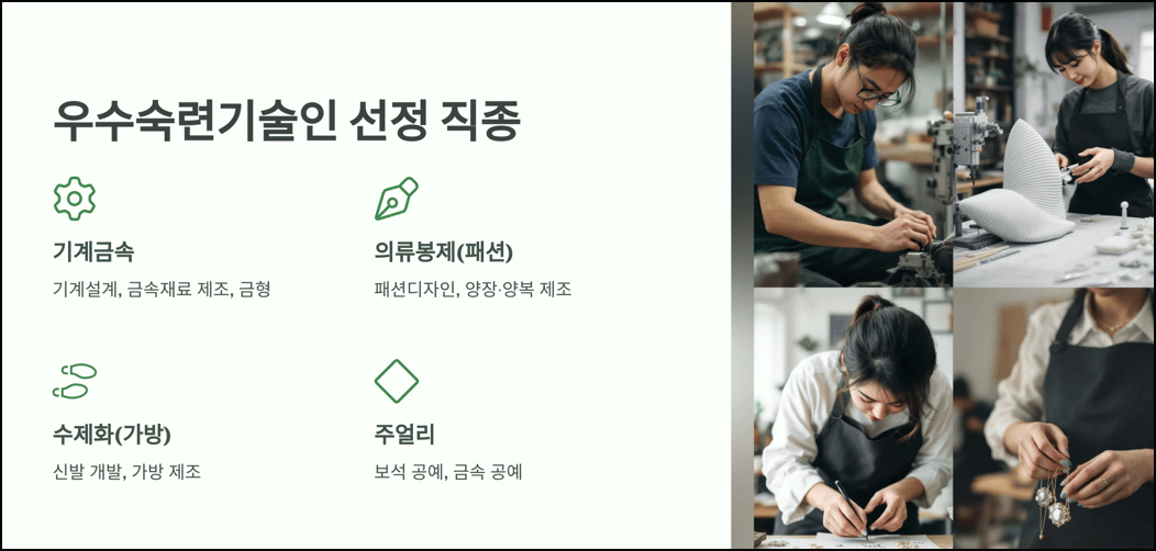 서울시는 숙련기술자들이 활동하는 다양한 분야에서 우수숙련기술인을 선정하고 있습니다. 총 다섯 가지 직종이 해당하며, 세부 분야를 확인해 보세요.