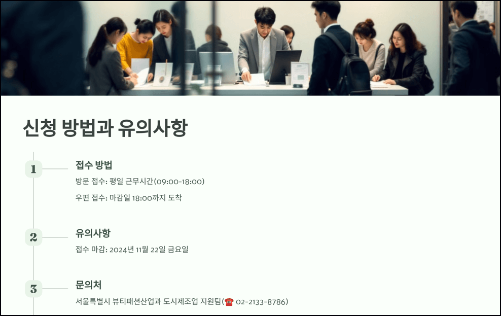 - 문의처: 서울특별시 뷰티패션산업과 도시제조업 지원팀(☎ 02-2133-8786)