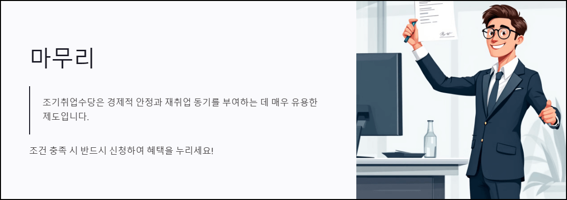 조기취업수당은 경제적 안정과 재취업 동기를 부여하는 데 매우 유용한 제도입니다. 조건에 부합하는 경우 반드시 신청하여 혜택을 누려 보세요!