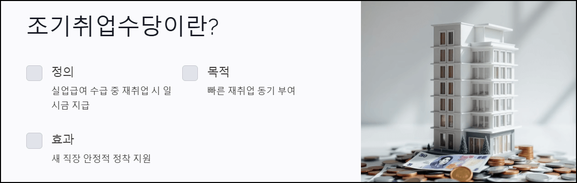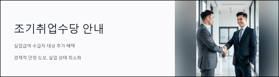 조기취업수당은 실업급여를 받는 도중 일정 조건을 충족하며 재취업한 경우, 남아 있는 실업급여 일부를 일시금으로 지급하는 제도입니다.