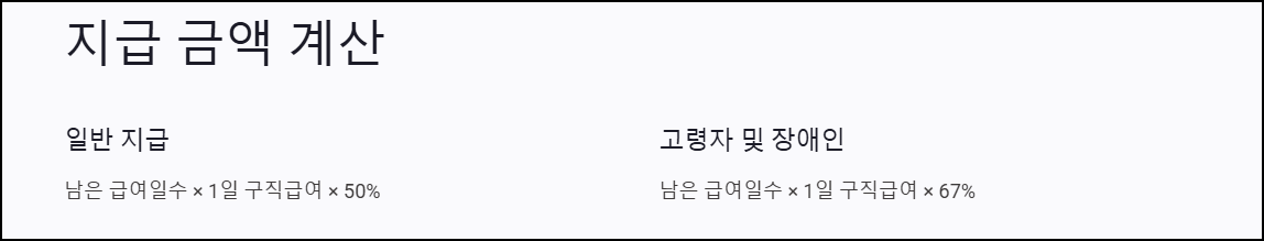 - 계산법: 남은 소정 급여일수 × 1일 구직급여 × 50%