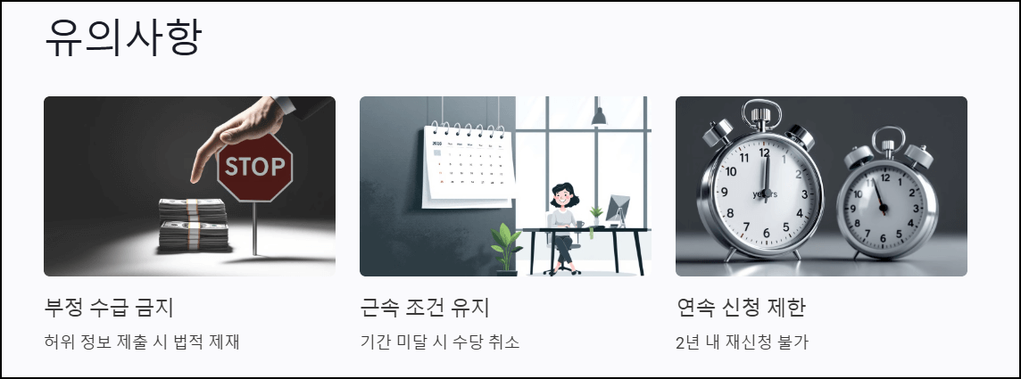 - 허위 정보 제출이나 조작된 서류로 신청 시, 지급된 금액 전액 환수 및 법적 제재가 부과됩니다.