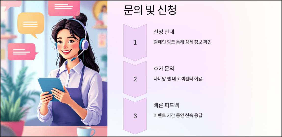 지원 대상자는 나비얌 앱을 통해 추가 문의를 할 수 있으며, 이벤트 기간 동안 앱 내 고객센터를 통해 빠른 피드백을 받을 수 있습니다.