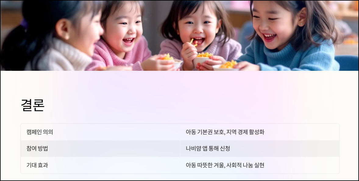 이상으로 이번 아동급식카드 식사지원 캠페인에 대한 안내를 마칩니다. 사회적 약자를 위한 이 캠페인이 많은 분들의 관심 속에서 성공적으로 진행되길 바라며, 모두가 따뜻하고 안전한 연말을 맞이하길 기원합니다.