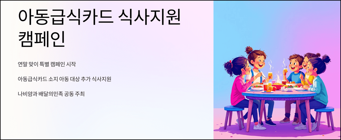 연말이 다가오면서 마음 따뜻한 후원의 손길을 기다리는 아동들을 위한 특별한 캠페인이 시작되었습니다. 바로 ‘아동급식카드 식사지원 캠페인’인데요. 이번 캠페인은 아동급식카드를 소지한 아동들을 대상으로, 추가적인 식사지원을 통해 경제적 부담을 덜어주고 건강한 식사를 제공하려는 목적으로 마련되었습니다.