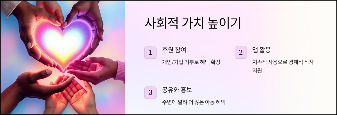 - 해당 캠페인을 주변 사람들에게 공유하고 알려서 더 많은 아동들이 혜택을 받을 수 있도록 도움을 줄 수 있습니다.