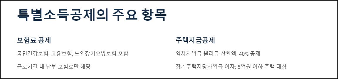 특별소득공제는 근로소득자만 받을 수 있는 세금 공제 제도입니다. 이는 근로소득금액에서 일정 금액을 공제해 세액을 줄이는 효과가 있습니다. -대표적인 항목으로는 보험료 공제와 주택자금공제가 있습니다.