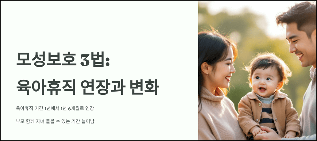 최근 국회에서 통과된 모성보호 3법에 따라 육아휴직 기간이 기존 1년에서 1년 6개월로 연장되었습니다. 부모가 육아에 적극 참여할 수 있는 다양한 변화가 도입되며, 이제는 부부가 함께 자녀를 돌볼 수 있는 기간이 더 넉넉해졌습니다.