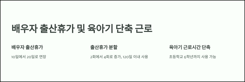 이번 개정안에서는 배우자 출산휴가가 기존 10일에서 20일로 늘어나, 출산 후 남편이 아내와 아이를 함께 돌볼 수 있는 시간이 더욱 길어졌습니다.