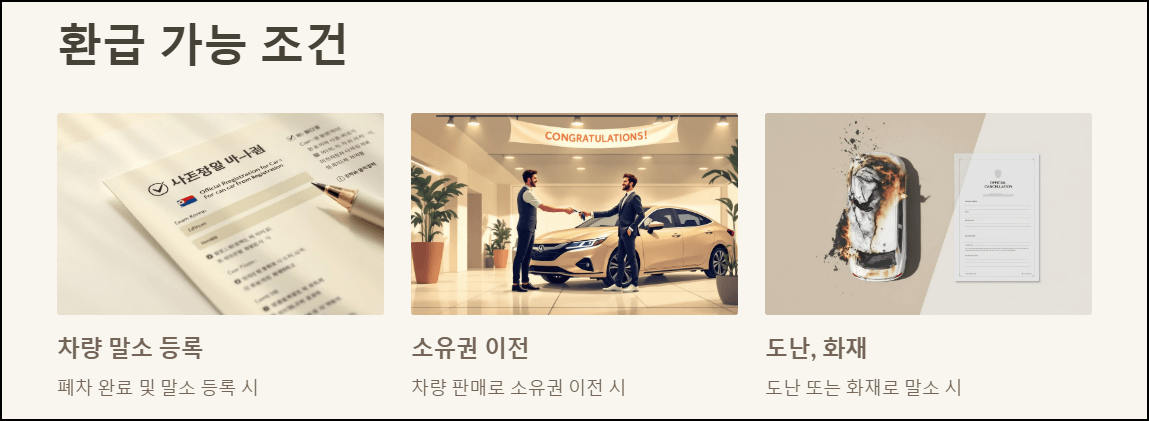 - 도난, 화재: 도난 또는 화재로 말소된 경우에도 환급 가능.