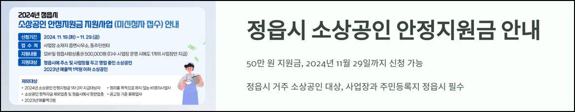- 문의처: 정읍시청 지역경제과 또는 소상공인지원팀(☎ 063-539-5613)