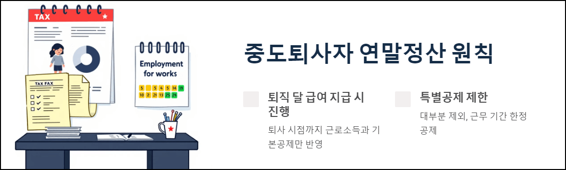 중도퇴사자의 연말정산은 퇴직하는 달 급여 지급 시 함께 이루어집니다. 이때 퇴사 시점까지의 근로소득과 기본공제 항목만 반영되며, 특별공제는 대부분 제외됩니다.