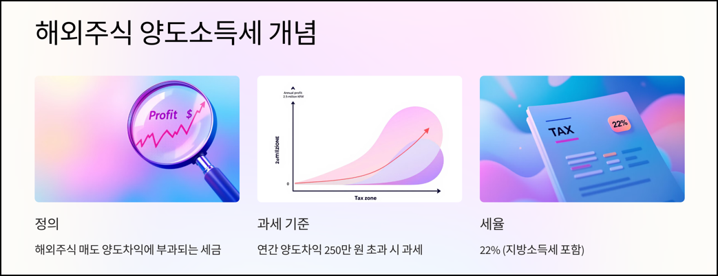해외주식 양도소득세는 해외주식을 매도해 얻은 양도차익에 부과되는 세금입니다. 국내 주식과 달리 과세 대상이 명확하며, 신고 의무도 개인에게 부여됩니다.