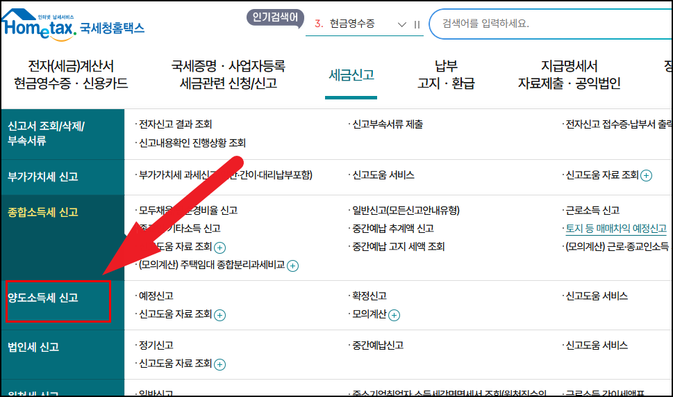 - 양도소득세 메뉴 선택: 신고서 작성 및 세액 계산