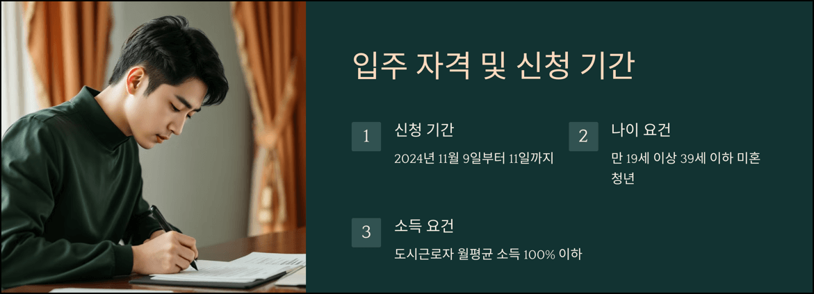 - 소득 요건: 세대의 월평균 소득이 전년도 도시근로자 가구당 월평균 소득의 100% 이하