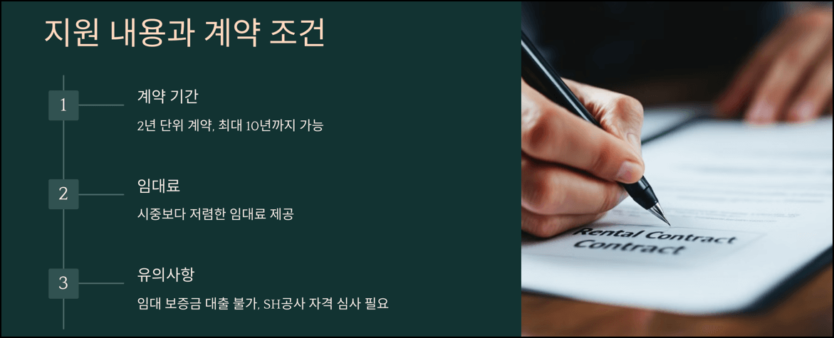 SH공사와 협동조합이 운영하여 시중 임대료보다 낮은 비용으로 주거를 제공합니다. 최대 10년 동안 저렴한 임대료로 안정적인 주거가 가능합니다.