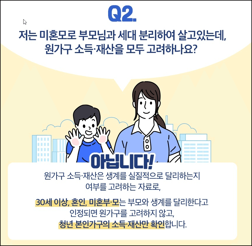 - 원가구 중위소득 100% 이하, 재산가액 4억 7천만 원 이하