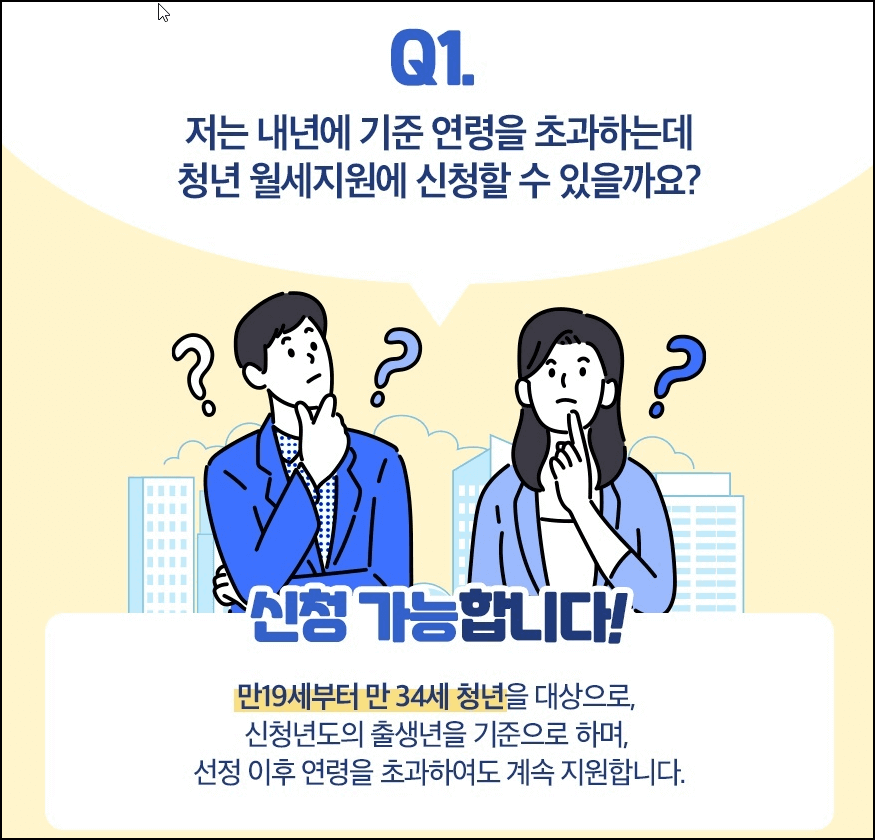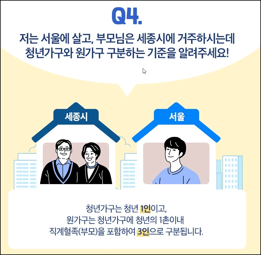 19세 ~ 34세 청년으로서 부모님과 떨어져 별도로 거주하고, 2024년 4월 12일부터 거주요건이 폐지되어 그동안 거주요건에 부합하지 못하여 신청 못하신 분들도 신청 가능합니다.