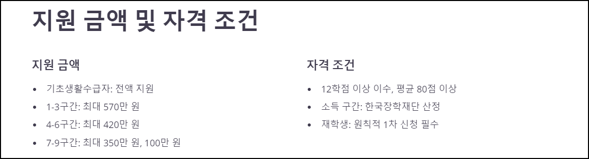 국가장학금은 소득구간별로 차등 지원됩니다. 자격 조건을 충족하면 등록금 부담을 크게 줄일 수 있습니다.