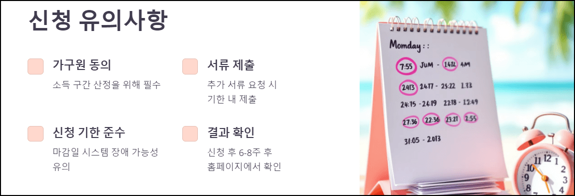- 신청 기한 준수: 마감일에 접속자 폭주로 인해 시스템 장애 가능.