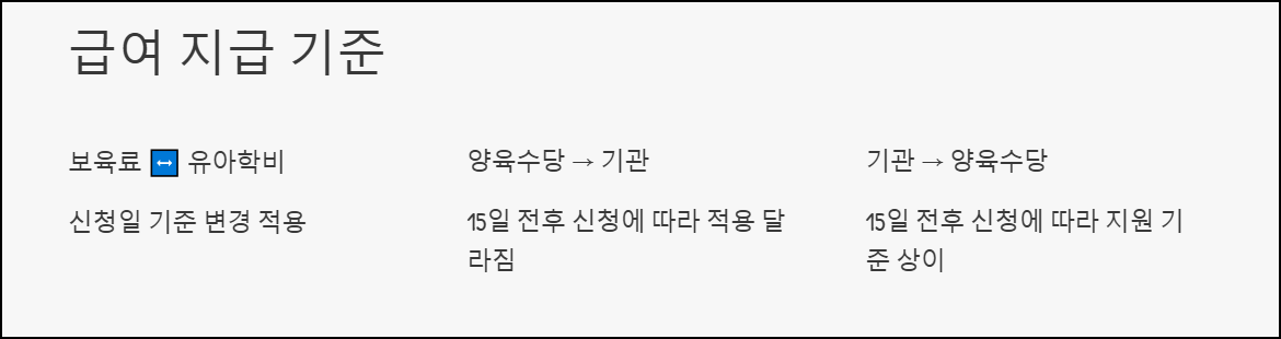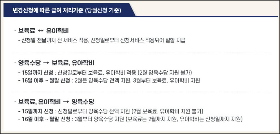 보육료, 유아학비, 양육수당 변경 신청 시 지급 기준이 다를 수 있으므로, 아래 내용을 참고하세요.