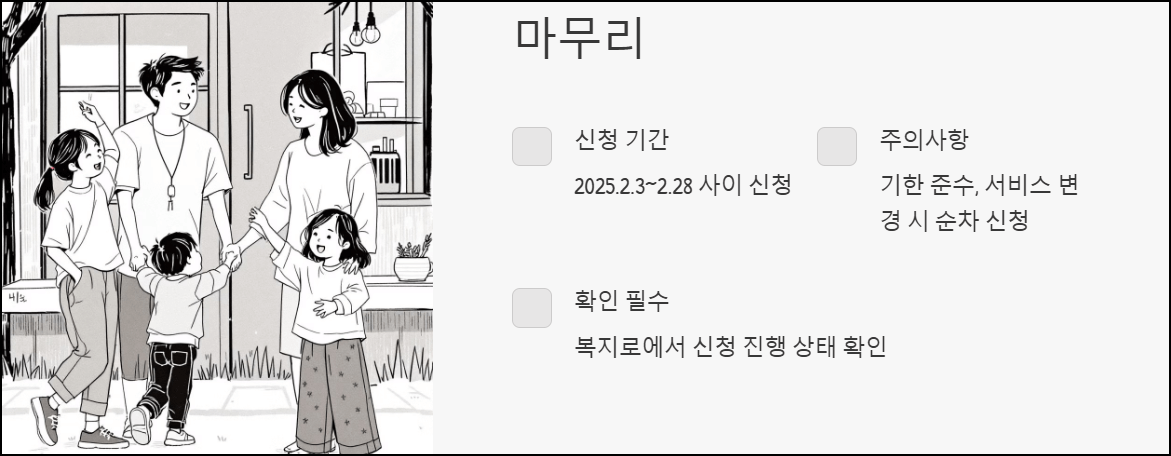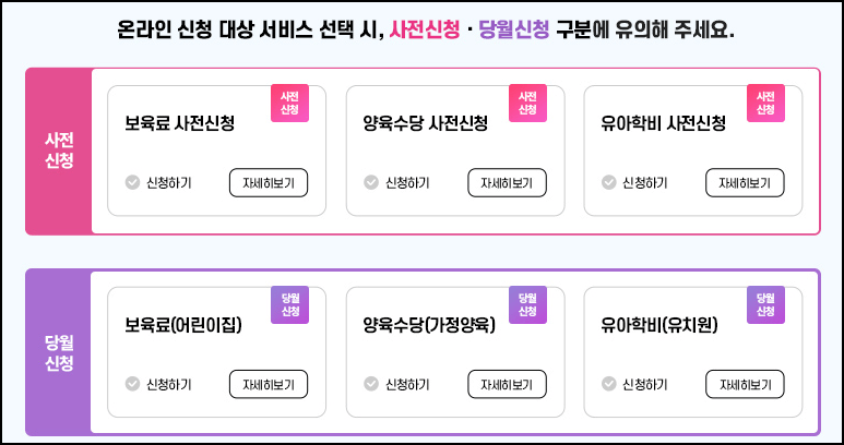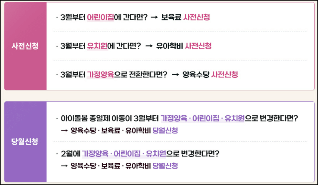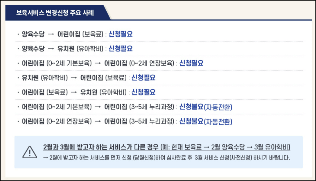 - ✔ 2월 15일까지 신청: 변경 서비스 즉시 적용 (2월 양육수당 지원 불가)