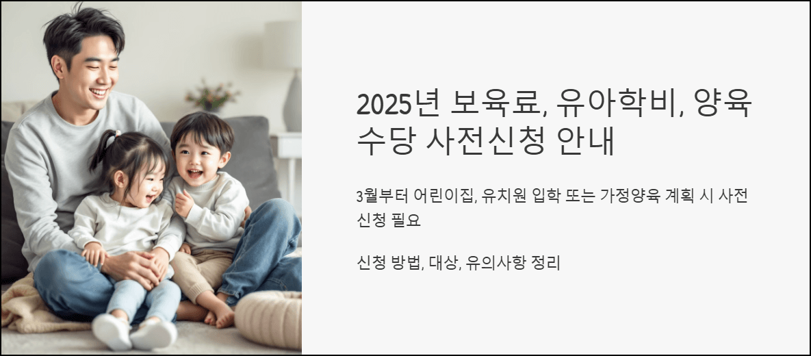 2025년 보육료, 유아학비, 양육수당 사전신청이 시작됩니다. 3월부터 어린이집, 유치원 입학 또는 가정양육을 계획 중이라면, 사전신청을 통해 원활한 지원을 받을 수 있도록 준비하세요.