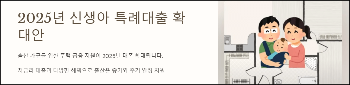 출산 가구를 위한 주택 금융 지원이 2025년 대폭 확대됩니다. 신생아 특례대출은 출산율 증가와 주거 안정 지원을 목표로 저금리 대출과 다양한 혜택을 제공합니다.