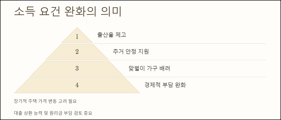 이번 소득 요건 완화는 출산 가구의 경제적 부담을 덜어주고 주거 안정을 돕기 위한 정책적 배려로 해석됩니다.