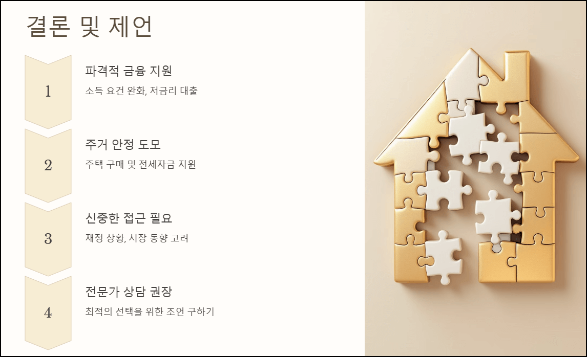 하지만, 정부 정책을 활용하더라도 본인의 재정 상황과 주택 시장 동향을 철저히 고려해야 합니다. 대출 상환 계획을 세우고 전문가의 상담을 통해 최적의 선택을 하시길 바랍니다.