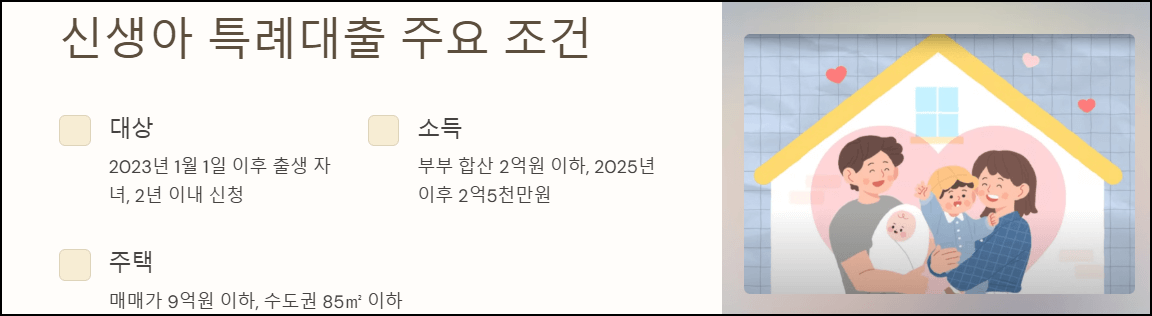 - 2025년 이후 출산 가구는 2억 5,000만 원 이하로 상향 예정