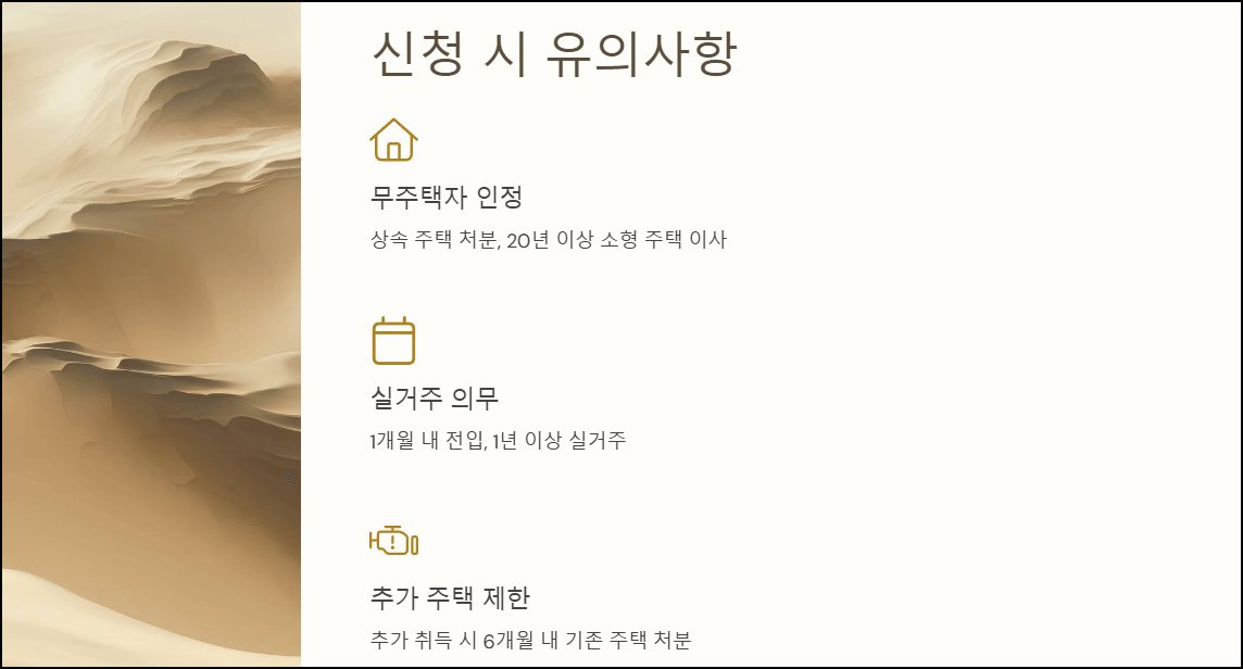 - 실행일로부터 1개월 내 전입 후 1년 이상 실거주해야 합니다.